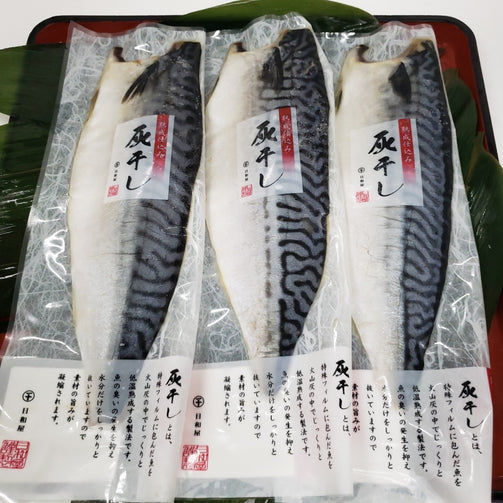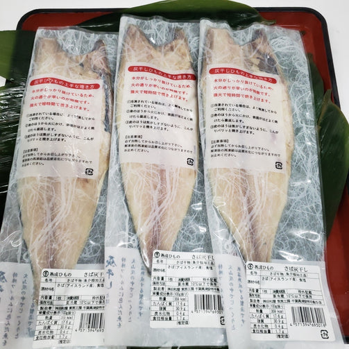「灰干し」とは、特別な布やセロハンで包んだ魚を火山灰の中に長時間漬け込み、じっくりと水分を抜く製法です。魚の臭みや水っぽさの原因と言われる細胞内の余分な水分まで取り除きますので、干物とは思えない柔らかな食感と旨味の詰まった最高の味が出来上がりま表面が乾かないため身がふっくらと仕上がるので、脂が多い魚に向いている熟成方法と言われます。通常の干し方と違って酸化や魚の細胞を傷めないので、旨味成分(天然アミノ酸)がより多く残ります。「低塩・無添加」の体に優しく、美味しい干物です。アイスランド産の脂のりの良いサバを使用しています。1枚200g。冷凍。