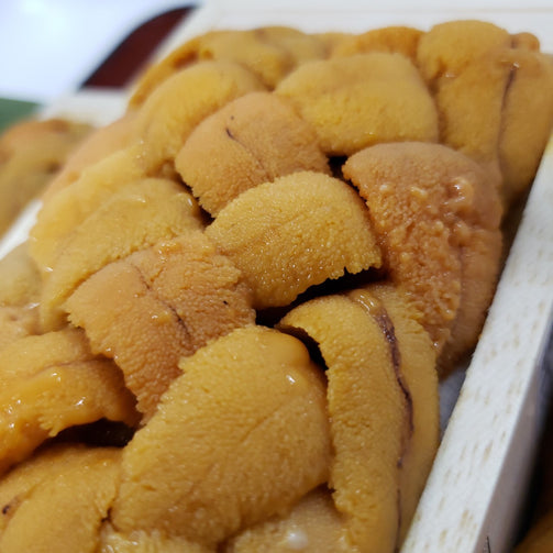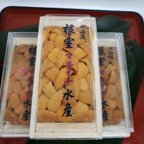 この時期はロシア産のバフンウニを使用。ミョウバンが少なくウニの甘みが堪能できます。1箱100g入。冷蔵。